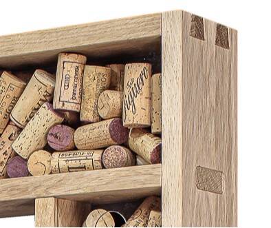 Die einzelnen Eichenholzelemente des WEINRAHMENS passen wie Puzzleteile perfekt ineinander. Sie sind durch präzis gefertigte, offene Schwalbenschwanz- und Zapfen-Loch-Verbindungen äusserst stabil und ganz ohne Klebstoff oder Schrauben miteinander verbunden. Funktionale Hingucker, sozusagen.