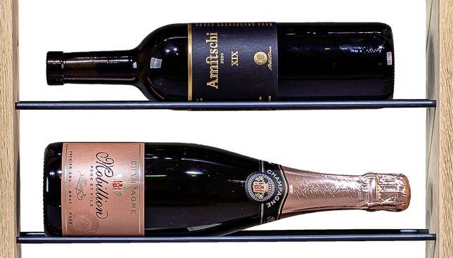 Für jede Flasche ist die Auflage mittels zwei 6 mm starken, geölten Stäben aus Rohstahl realisiert. Egal ob Bordeauxflasche oder Burgunderflasche, durch dieses Auflagesystem lassen sich Flaschen unterschiedlicher Formen und Grössen perfekt parallel zu einander und zentriert platzieren. Unabdingbar für eine gelungene Präsentation!